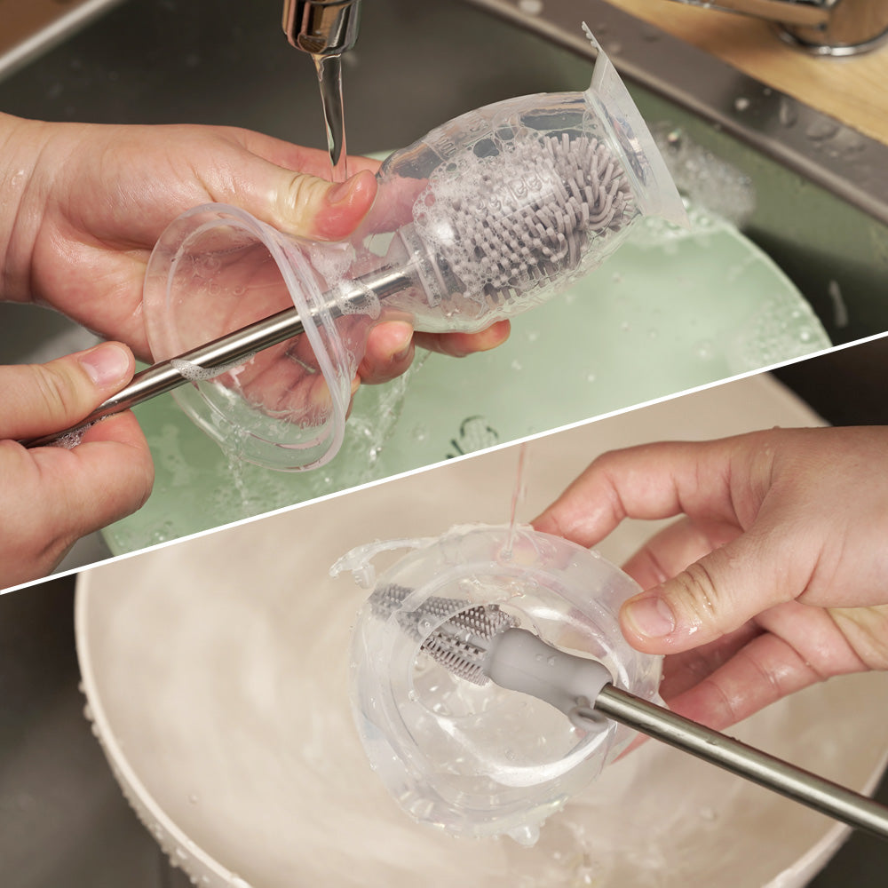 Flexible silicone bristles clean bottles, teats and accessories thoroughly and hygienically.